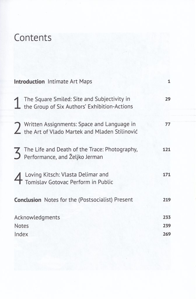 Looking to circumvent the rigid bureaucracy of official art institutions, this freewheeling group of conceptual artists and their peers brought artistic activities directly to an unwitting public by staging provocative performances, exhibiting artworks, and interacting with passersby on the streets. Exploring artworks such as Vlasta Delimar’s act of tying herself to a tree in a busy pedestrian area, Željko Jerman’s production of a giant banner declaring “Intimate Inscription” in the city’s central square, and Vlado Martek’s creation of an artwork on a seaside beach using women’s underwear, Adair Rounthwaite examines the work of these artists as a site of tension between the intimacy of artistic expression and the political structure of the public sphere under state socialism.