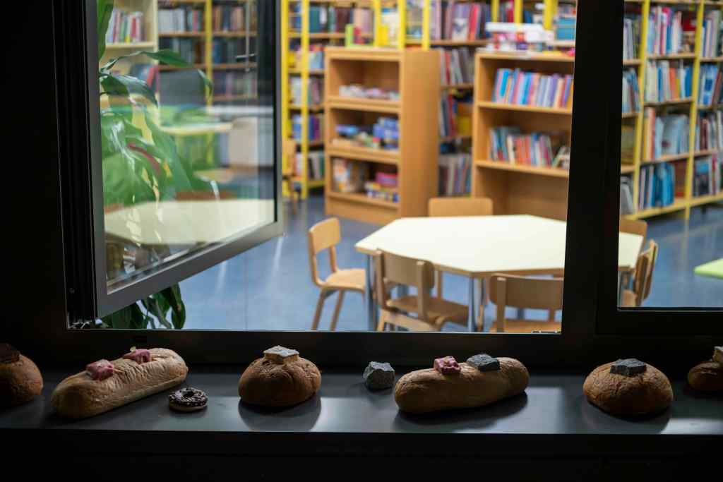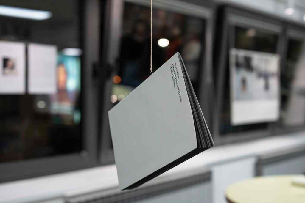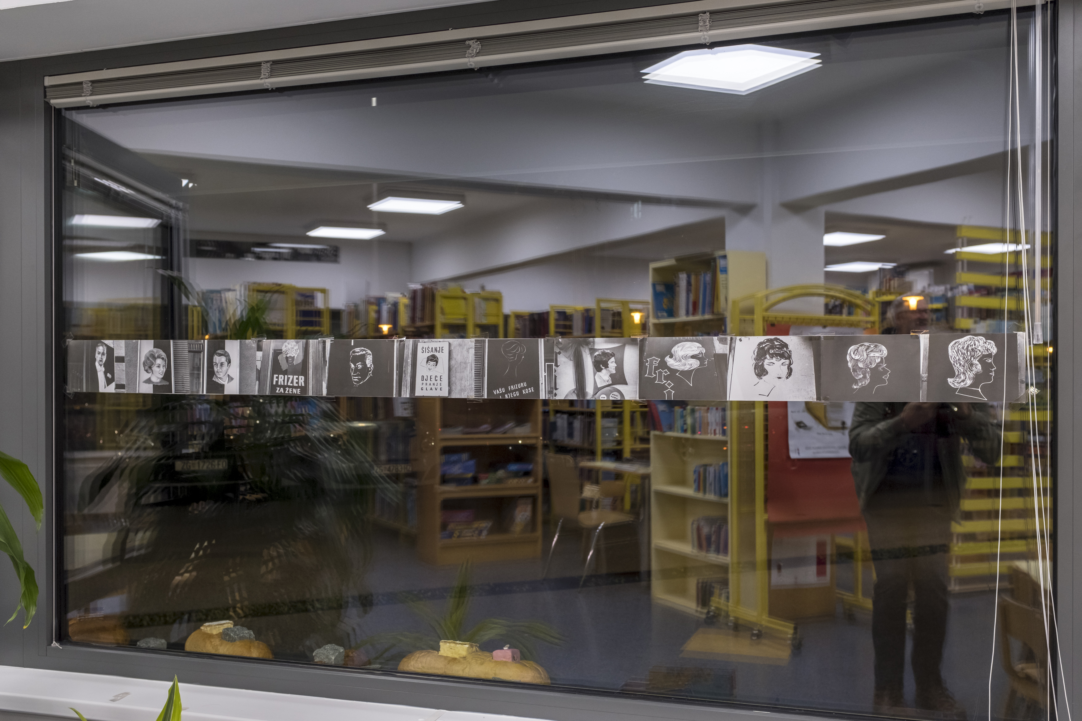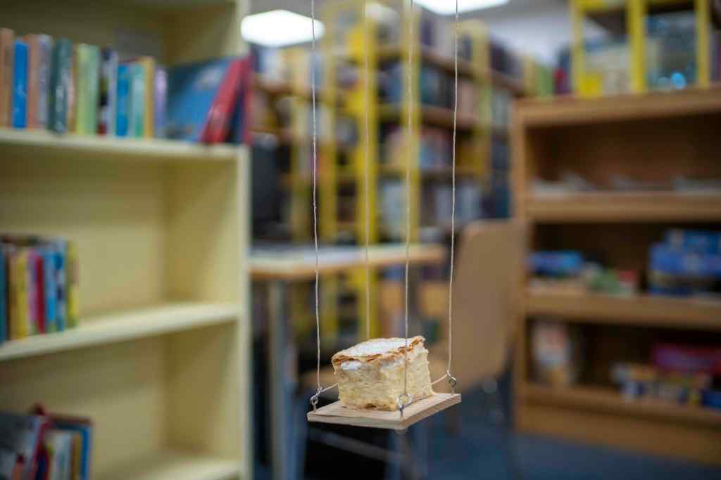 The entire exhibition is a space of negotiation. A call to conversation. It gets into the space, it parasitises, it dismembers it functionally. The works are found in places in which they are not expected, but into which they logically fit. For example, the photographs of smiles affixed to the floor at the entrance itself are simultaneously a welcome greeting that ought to be trodden or skipped over. The swing with a custard slice is situated directly by children’s picture books, so closely that a child may brush past it, swing it a bit. The video Spelling Book behind the shelves invites us to read together. The artist’s book Hairdressers with a series of photographs of hairdressers’ signage is spread out and affixed to the window, while the object Summer is set up in front of the doors. The inscriptions Grass and No Walking on Sidewalk are found on the sidewalk in front of the library.