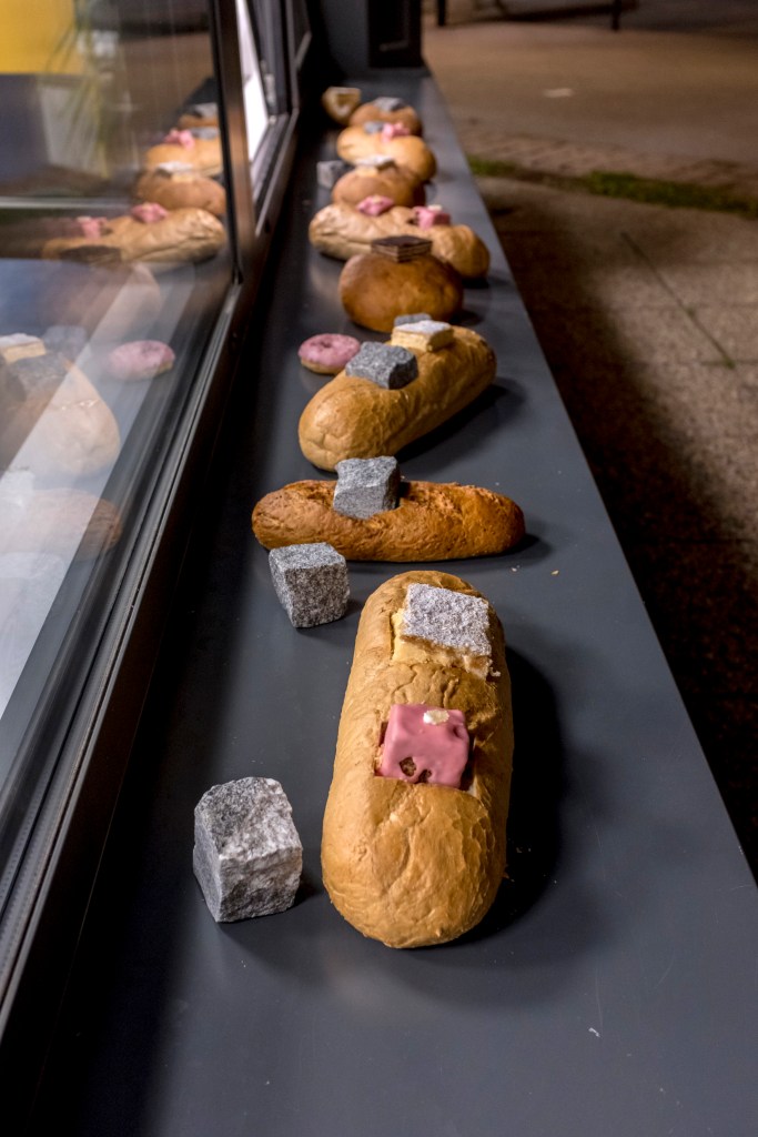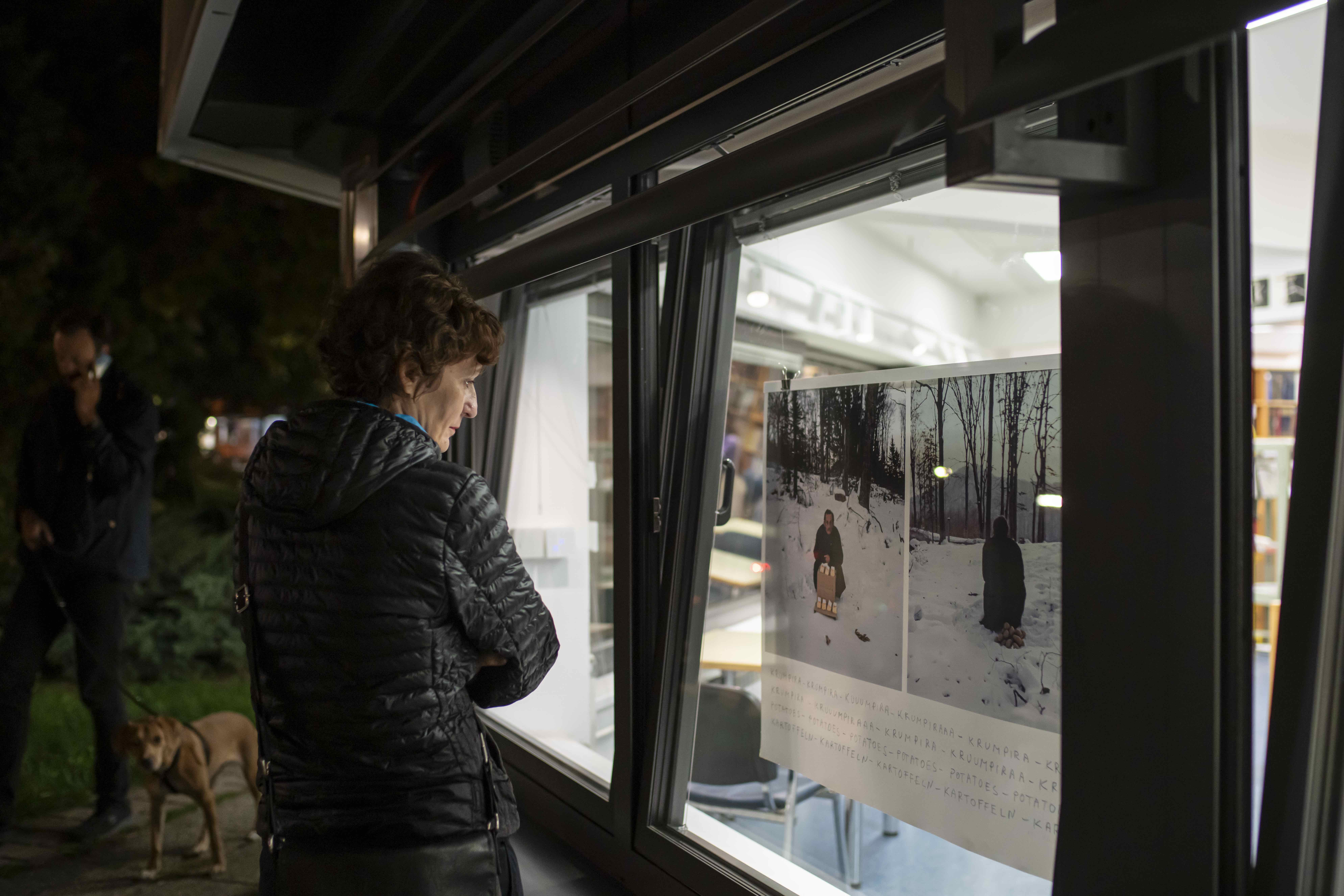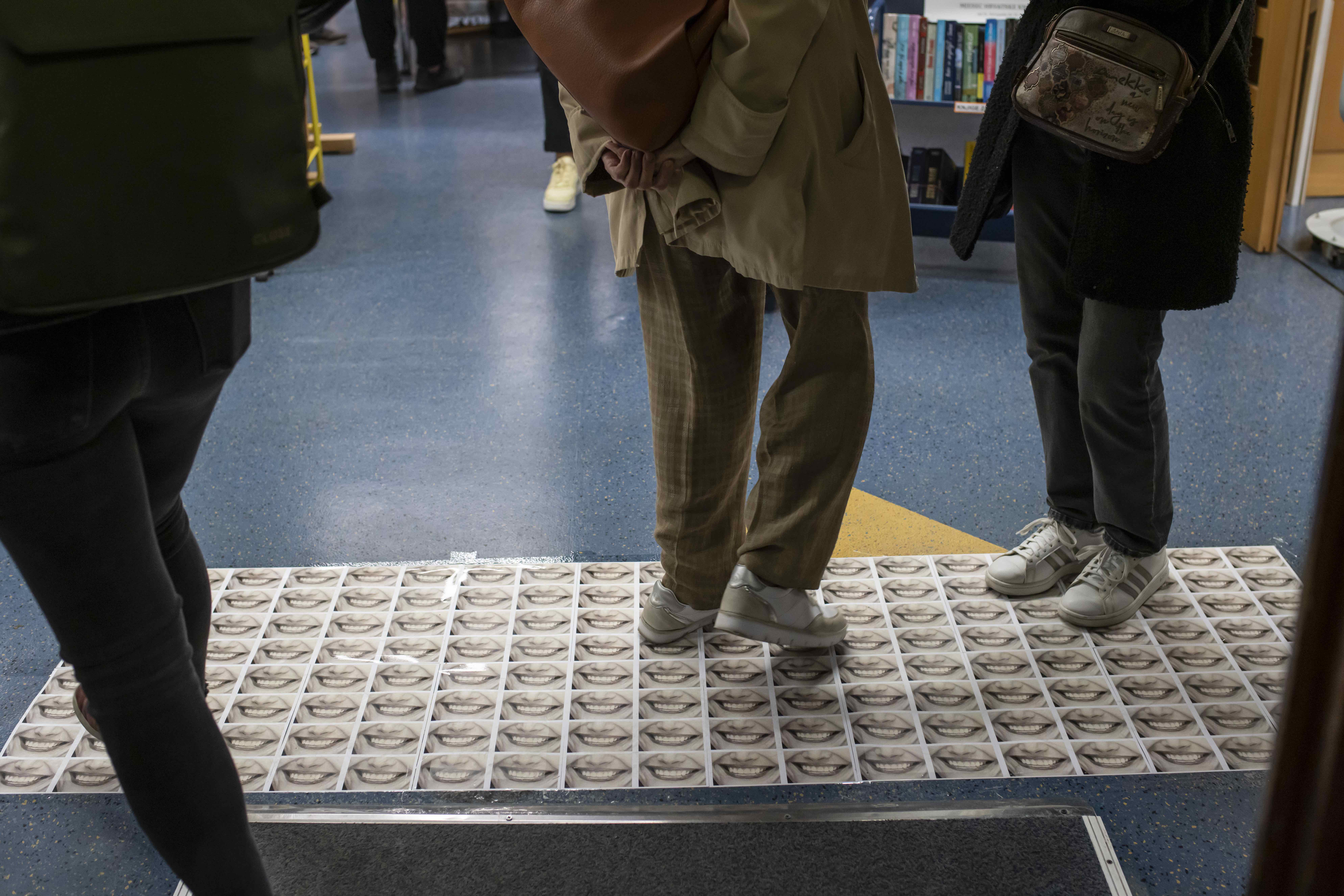 The entire exhibition is a space of negotiation. A call to conversation. It gets into the space, it parasitises, it dismembers it functionally. The works are found in places in which they are not expected, but into which they logically fit. For example, the photographs of smiles affixed to the floor at the entrance itself are simultaneously a welcome greeting that ought to be trodden or skipped over. The swing with a custard slice is situated directly by children’s picture books, so closely that a child may brush past it, swing it a bit. The video Spelling Book behind the shelves invites us to read together. The artist’s book Hairdressers with a series of photographs of hairdressers’ signage is spread out and affixed to the window, while the object Summer is set up in front of the doors. The inscriptions Grass and No Walking on Sidewalk are found on the sidewalk in front of the library.
