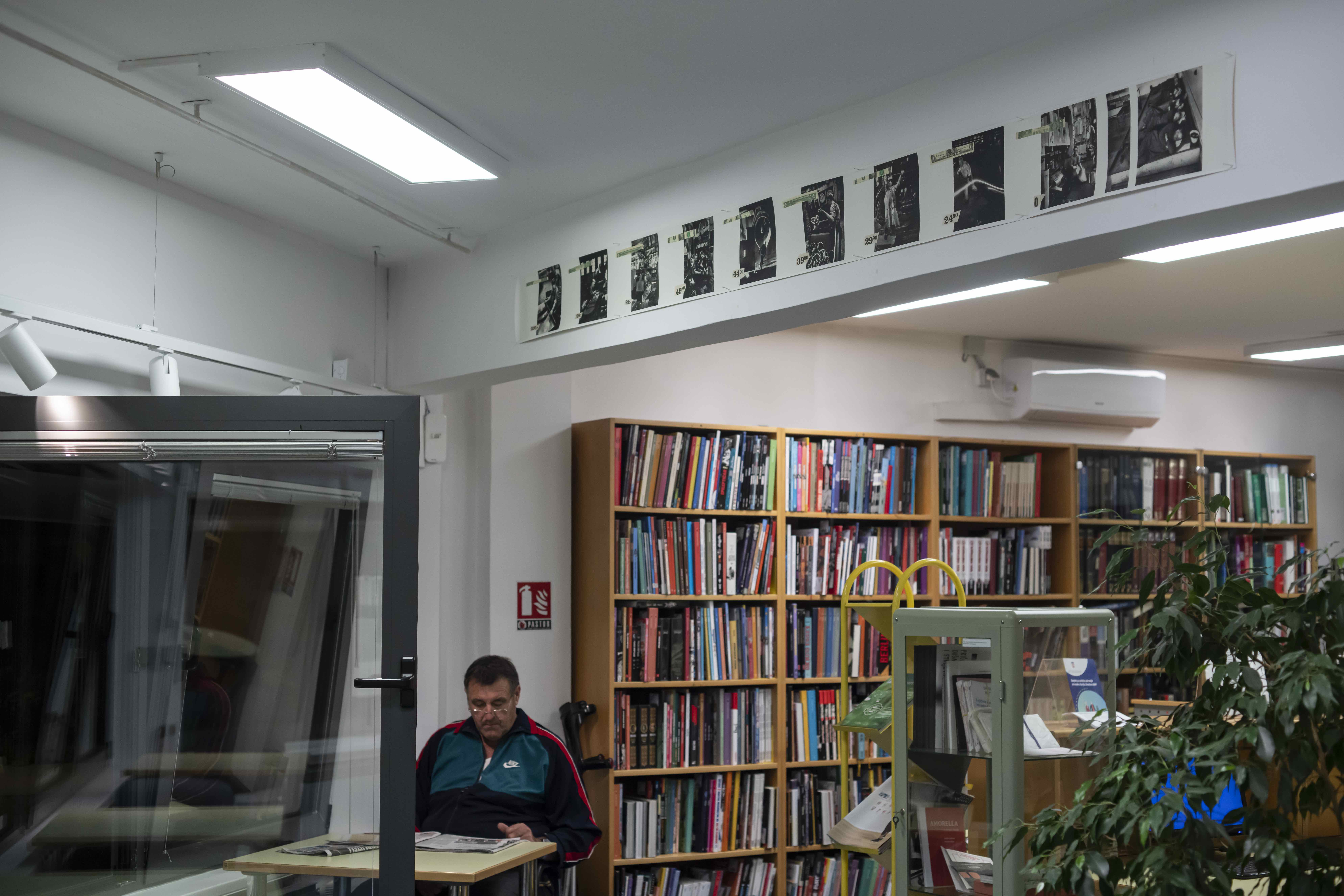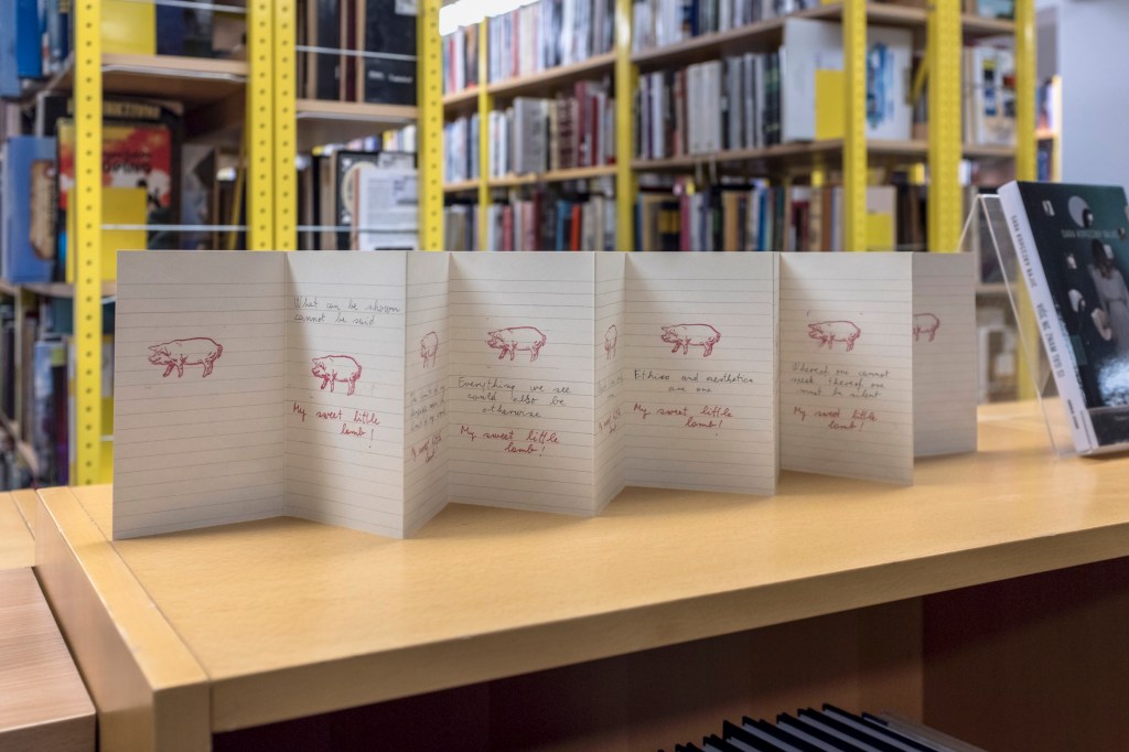 The series Artist at Work – photographs of the artist in bed, and The Pain Game – throwing of the dice whereby the result is always pain, are positioned above the shelves in the adult section, etc. At every step, a seemingly naïve gesture, a left-behind piece of paper, or a representation of reality invite the audience to react, to question, to think. A kind of humorous/spiritual invasion on the established ways of thinking, a subversion of that which is known, a call to resistance.