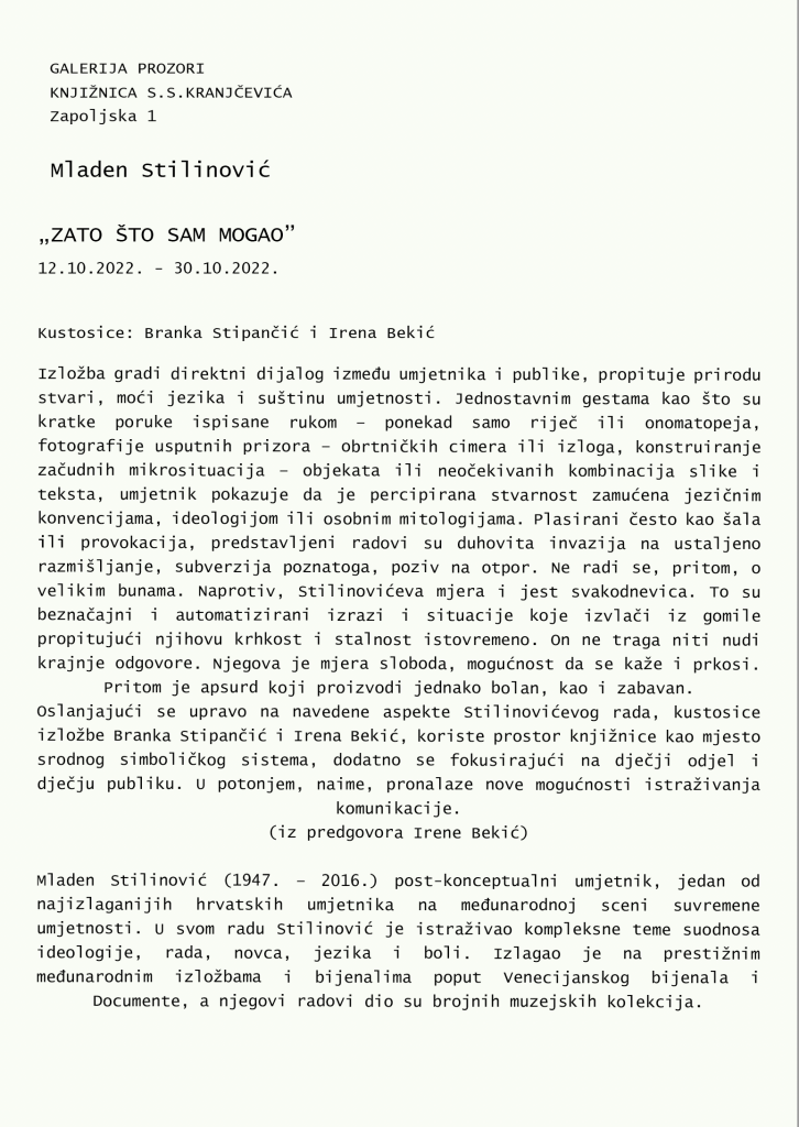 Thereby, they are not large-scale uprisings. Quite the contrary, Stilinović’s measure is indeed the everyday life. They are insignificant and automatised expressions and situations which he extracts from a heap, while simultaneously examining their fragility and permanence. He neither searches for nor offers definitive answers. His measure is freedom, the possibility to say and to defy something, and he also invites the audience to do the same. Thereby the absurdity he produces is as painful as it is entertaining.