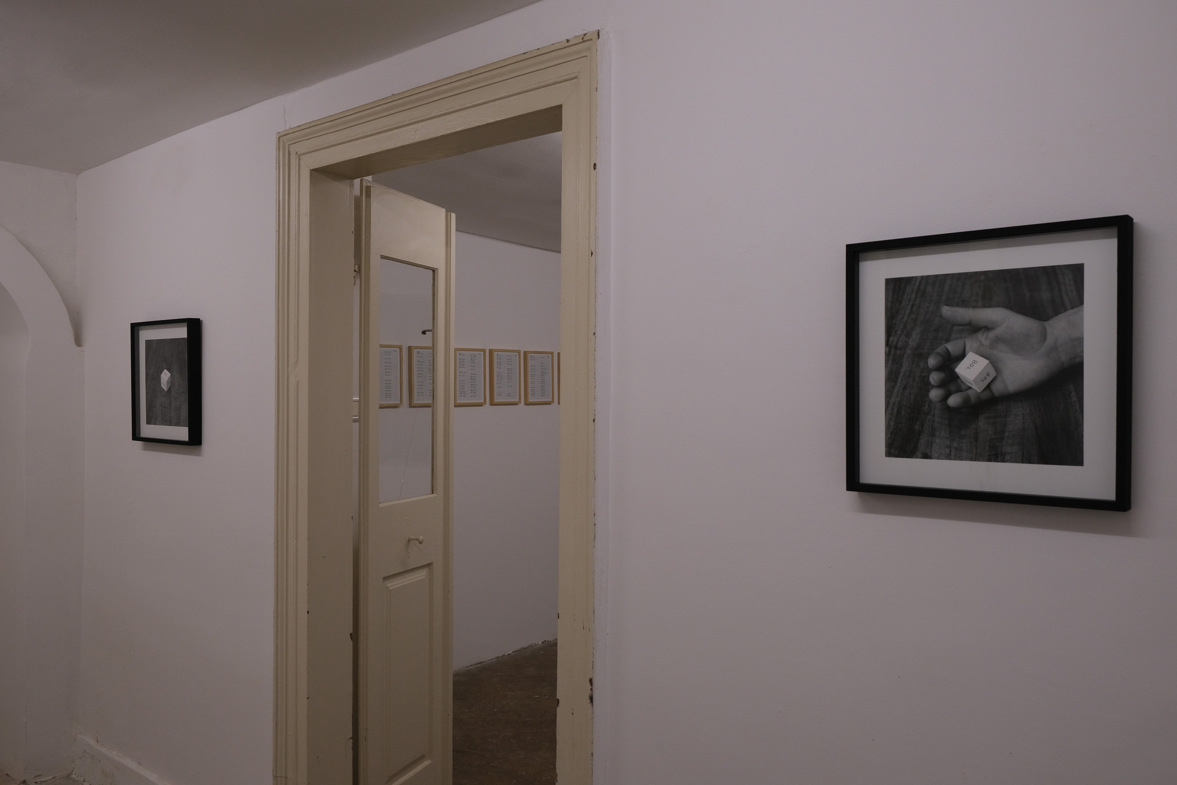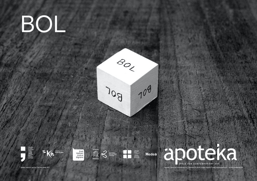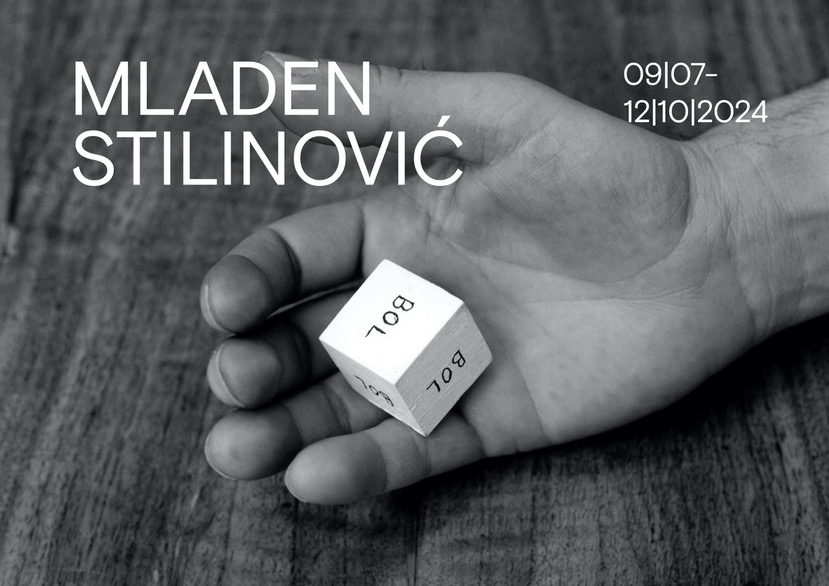 Across the three gallery rooms, Branka Stipančić sets out Stilinović’s work, adapting the existing space to his concepts. The first room, with the built-in pharmacy cabinet, is site-specific: a space of pain and healing unfolds through the language of pain. The central work is Igra Bol (The Pain Game), where Stilinović has hand-written the word Bol (pain) on each of the six sides of the cube. The game lasts seven minutes, and the outcome is inevitable – will rolling the dice eliminate chance when nothing exists but pain? Beyond pain, nothing.