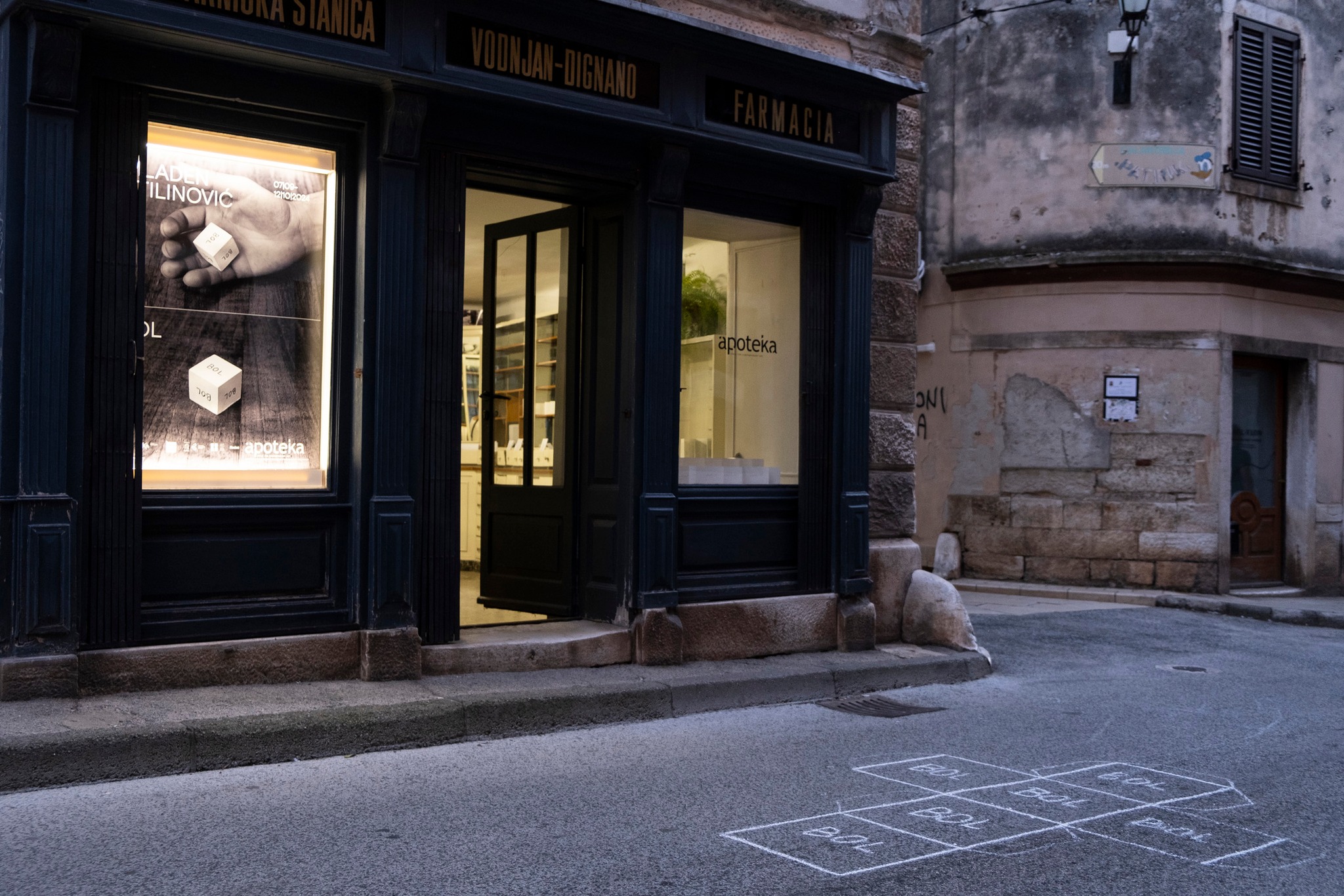In front of the pharmacy, an unfolded cube is drawn with chalk on the pavement, as in the children’s game of hopscotch, with the word Bol (pain) inscribed in each square. On closer inspection, we notice tiny wings attached to the squares that would allow the flat drawing to be easily reassembled into a three-dimensional cube. The open cube evokes the ‘pre-poetry’ of Vlado Martek, Stilinović’s fellow artist and close friend, and might almost be seen as a subtle invitation to the exhibition.