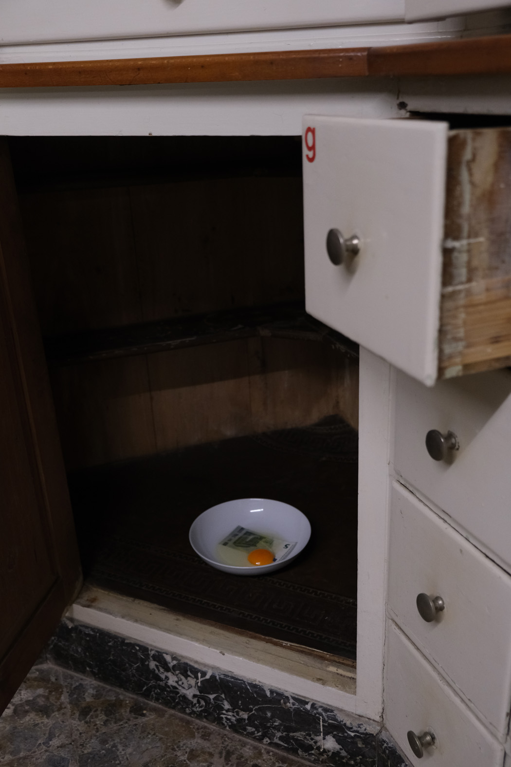 Branka Stipančić curates in Vodnjan’s Apoteka a small ‘edition’ of Mladen’s pain. On the shelves she places books: My Sweet Little Lamb, Subtracting Zeroes, I have no time. Above the shelves she places Stile’s photo series and books, his representative Artist at Work and The Foot – Bread Relationship. In the drawers that once used to safekeep medications she stores the fragments of Stile’s thoughts, ideas and quotes he loved, with the intention of almost making us hear his voice from within. In the first room she confronts us with powerlessness every step of the way, it is clearly before our eyes, but also hidden in small, irregular corners. Audience becomes a participant, if, of course, they dare to do so, because who knows what might be revealed when a person embarks on the quest of opening the drawers of pain? The process is additionally exalted by mirrors which give us a chance to face ourselves in that exploration. Going deeper into the space, we get a chance for a brief pause before entering the last room, where we are confronted and surrounded by the cruelty of pain. Although we find ourselves in a similar reading process as it was with the booklet I have no time, here Dictionary – Pain leaves us with extra space for an intimate experience and reconsideration of our own relationship with pain.