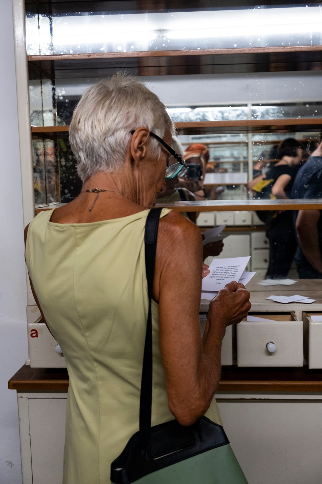 Another curatorial approach worth noting involves the original pharmacy drawers, where medicines were once stored – complete with handwritten labels detailing the drug’s name and dosage – which are used by Stipančić to store slips of paper with quotes from Stilinović’s books or interviews, adding depth to the artist’s voice. Stilinović often printed verses and texts related to pain in his exhibition catalogs and by incorporating this into the exhibition/artistic space, Stipančić creates an archive of quotes, Stilinović’s thoughts and readings, providing a unique guide through the exhibition. Visitors are free to take the slips of paper, assembling their own personal archive of the artist’s reflections.