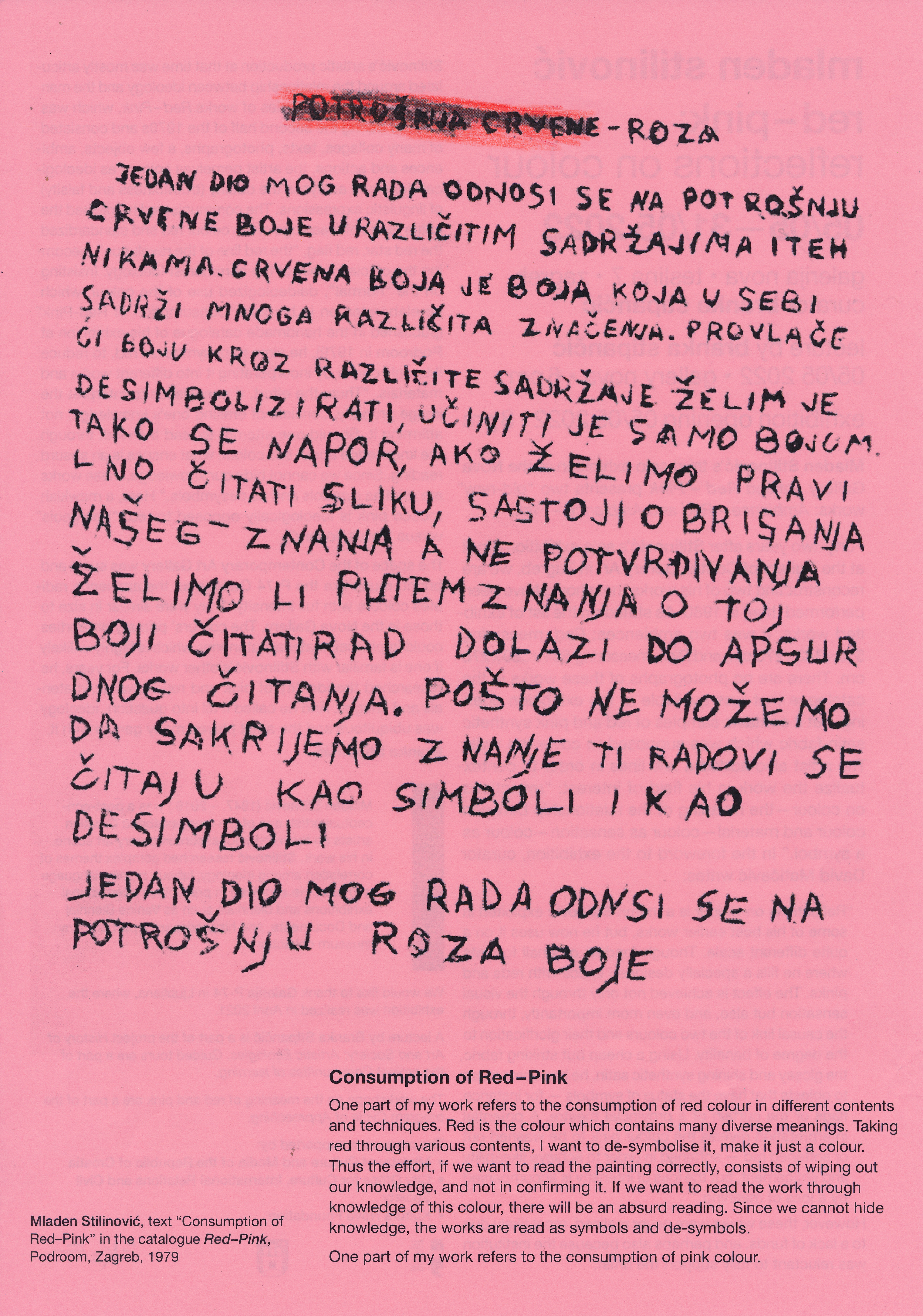 Mladen Stilinović: Red – Pink: Reflections on Colour, Gallery Nova, Zagreb, 2022 Gallery NovaTeslina 7, Zagrebcurated by Branka Stipančić05/05 – 31/05/2022 Share this: Click to share on X (Opens in new window) X Click to share on Facebook (Opens in new window) Facebook Like Loading...
