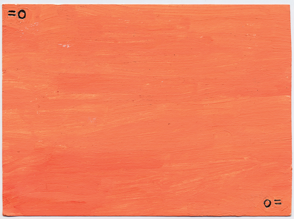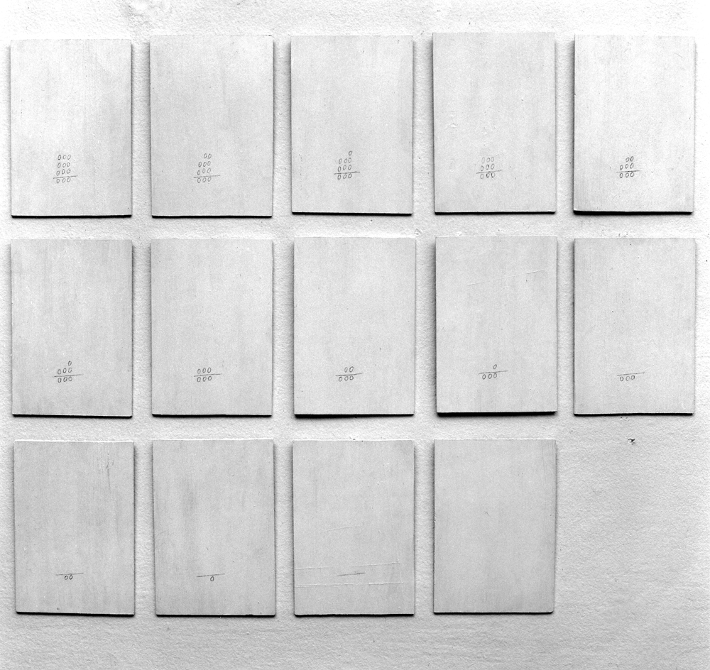Mladen Stilinović’s zero math paintings progress through a systematic subtraction of null values. While the zeros employed in Rivane Neuenschwander’s blank flip clock suspend the experience of duration, Stilinović’s zeros enact a subtle critique of value, progress, and production. Each small panel wryly goes through the mathematical motions, yet its value remains constant at nothing, even while each zero is carefully subtracted. Signified emptiness cedes more ground to the spatial emptiness of the canvas.