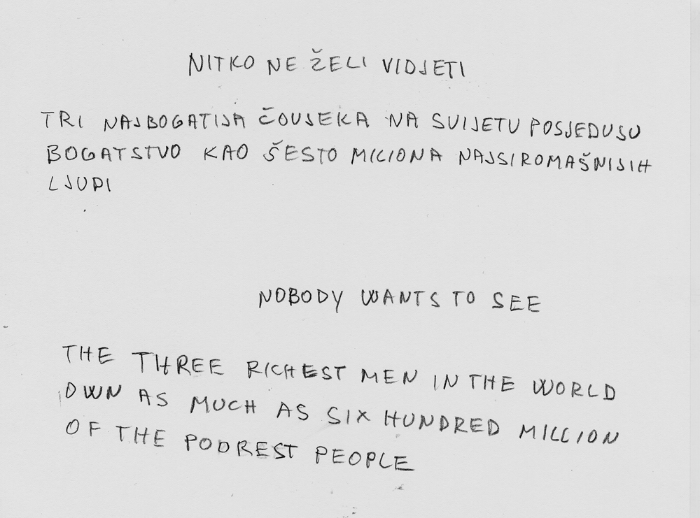 [3] Tihomir Milovac, “Bezvremeno siromaštvo [Timeless Indigence]”, in: Mladen Stilinović, Cinizam siromašnih, catalogue of an exhibition, ed. N. Beroš, T. Milovac, Zagreb, MSU, 2002, p. 14.