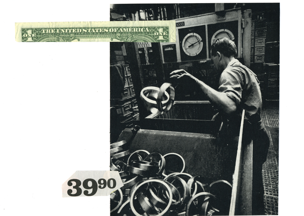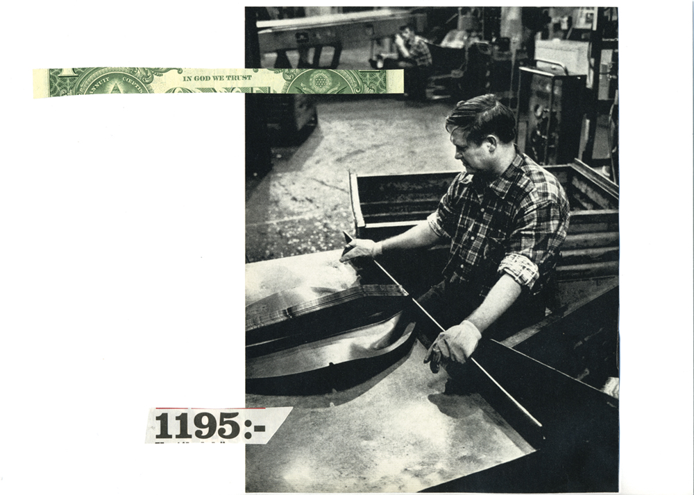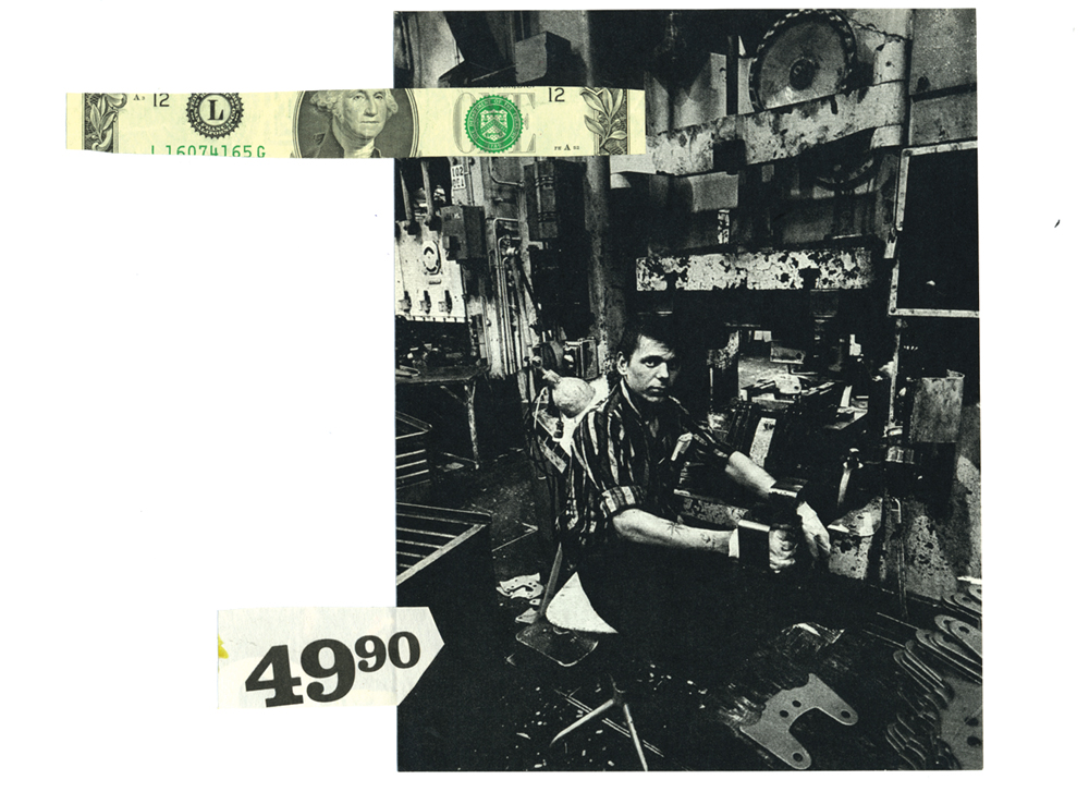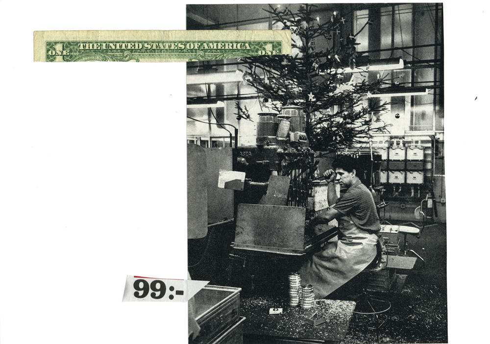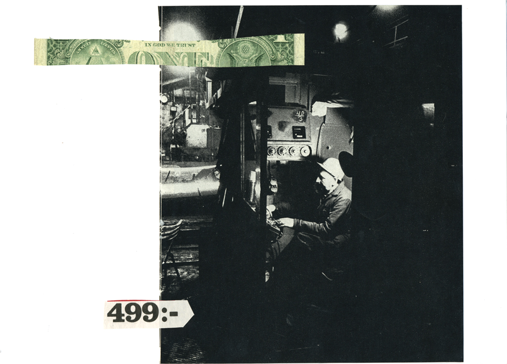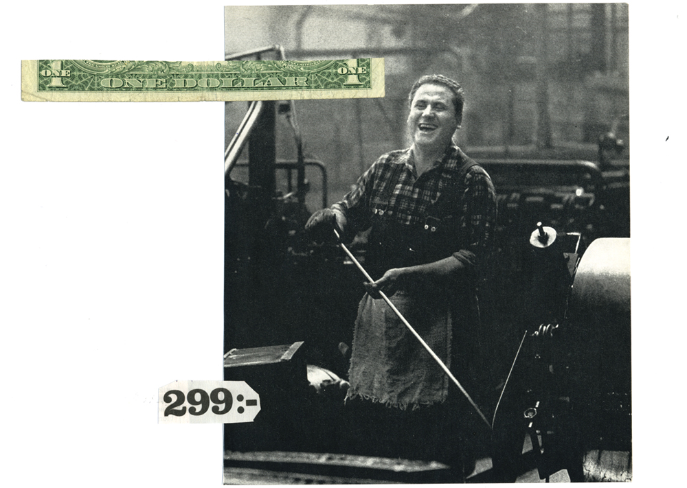 Mladen Stilinović made the series of images, Chinese Business, during a residency at Iaspis in Stockholm in 2009. Produced on standard copy paper, this two-dimensional series is comprised of three elements: black and white photographic images of miners and steel mill workers cut from literature documenting Swedish industrial history; prices taken from Swedish discount store advertisements; and seven-millimetre wide strips of US dollar bills. Stilinović’s extensive oeuvre – which uses language and various media to mirror and question the ideological signs that condition society – enables us to see these collages as a series in which a dramaturgy or anti-dramaturgy is formed. Even if a conventional narrative is not immediately apparent, an imminent story can develop intuitively in the mind of the reader.