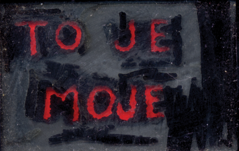 Red at the Biennale – a short action at the opening of the Venetian Biennale consisting of a 10-second exhibition of a small piece of paper with the text written in red pen “Red at the Biennale”, Venice, 1976.