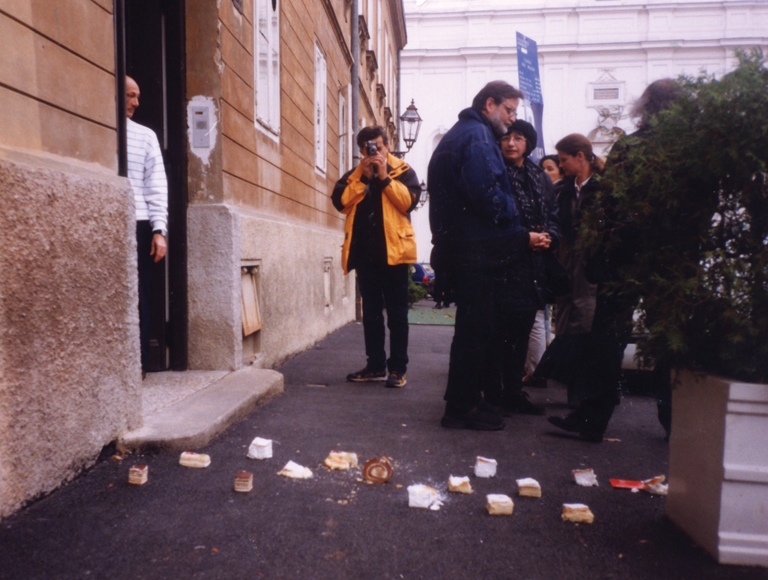 Intervention with cakes that he placed as obstacles on the pavement in front of the Museum of Contemporary Art on the occasion of the exhibition Fluxus, Zagreb, 1999.