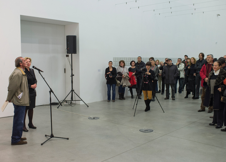 At the opening of the exhibition Zero For Conduct, the artist asked the audience to shout “You failed the test. Sit down!”, Museum of Contemporary Art, Zagreb, 2012.